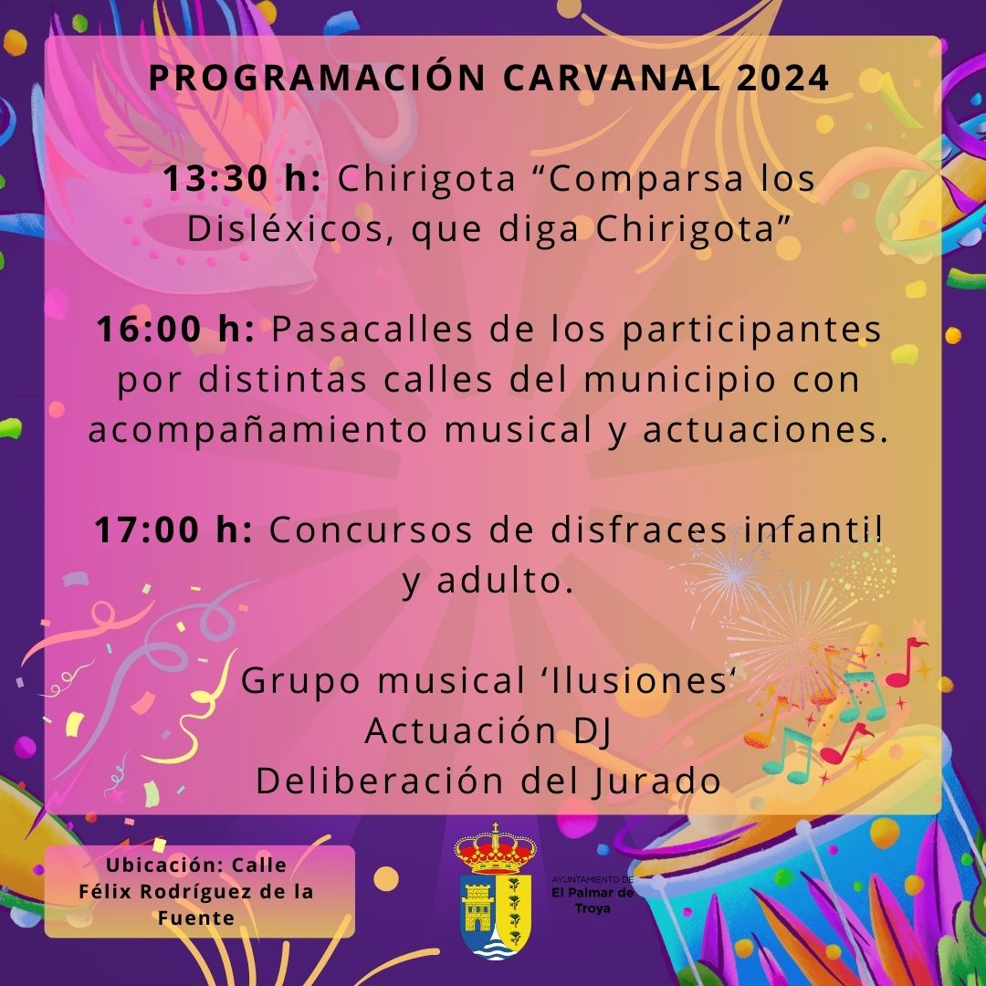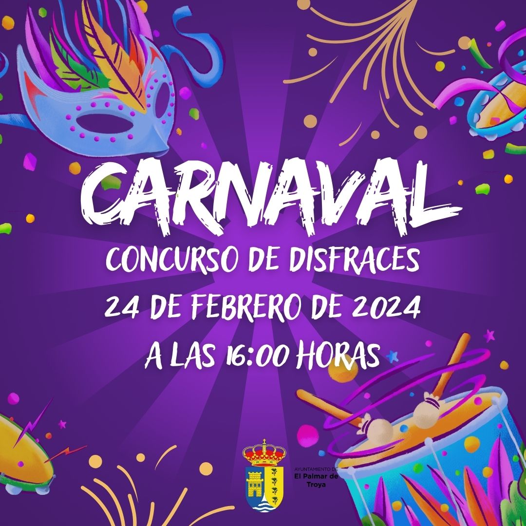 El Ayuntamiento de El Palmar de Troya, a través de la Delegación de Festejos y de Cultura, ha puesto en marcha el concurso de disfraces con motivo de la celebración del próximo carnaval, que tendrá lugar el día 24 de febrero de 2024 a las 16:00 horas en la calle Félix Rodríguez de la Fuente.